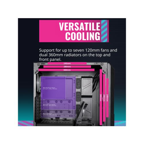 Featuring a stunning near-seamless glass panoramic view, showcasing your PC in all of its glory. Our full-fledged base package is aesthetically designed, exquisitely crafted and built with quality-tested high-performance components, including a spacious interior, digitally-controlled RGB lighting, and exclusive customizable options. Pure premium elegance at the best price.